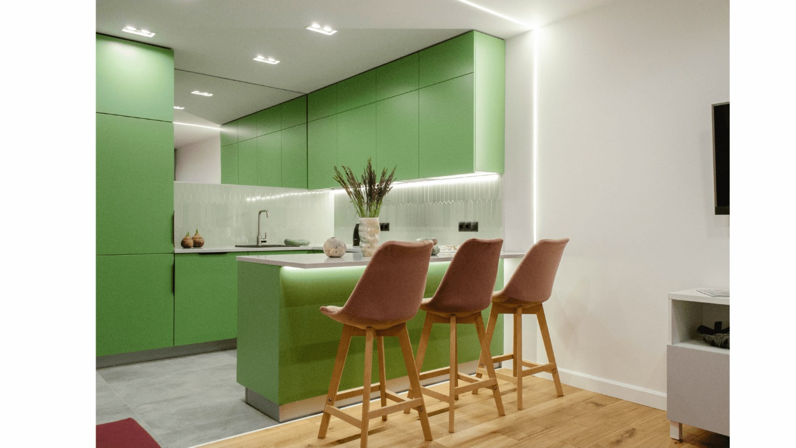 Зону кухни от гостиной визуально отделили профильным гипсовым светильником, встроенным в потолок и стену. Это практичное решение для интерьеров в современных стилях: минимализм, лофт, хайт-тек.